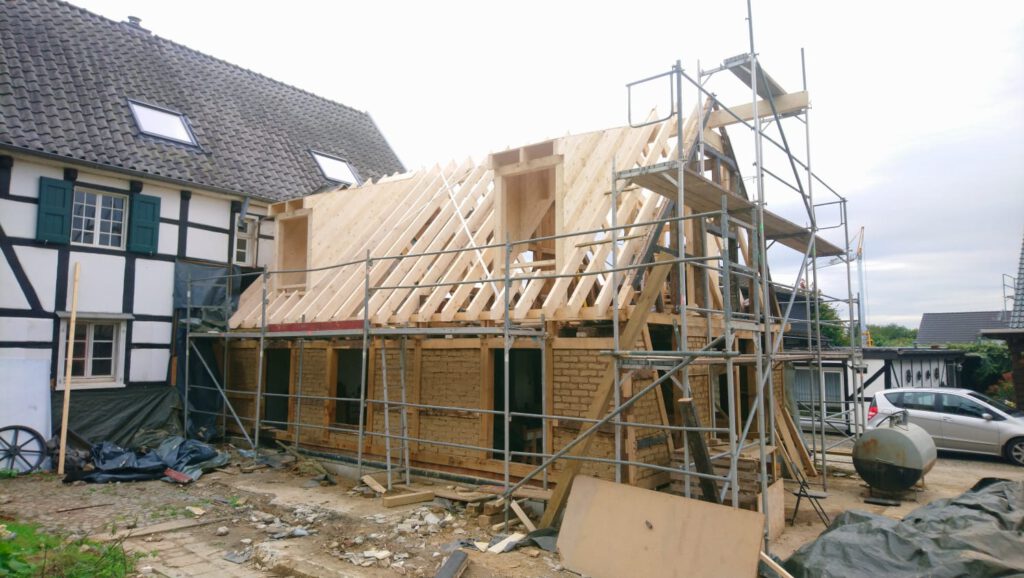 Wir legen Wert auf den Einsatz alter Handwerkstechniken – zum Beispiel im Bereich Fachwerkbau. Aber natürlich bauen wir auch nach neuen Standards – wie im Holzrahmenbau. Energetisches Bauen mit Holz – genau unser Ding.
