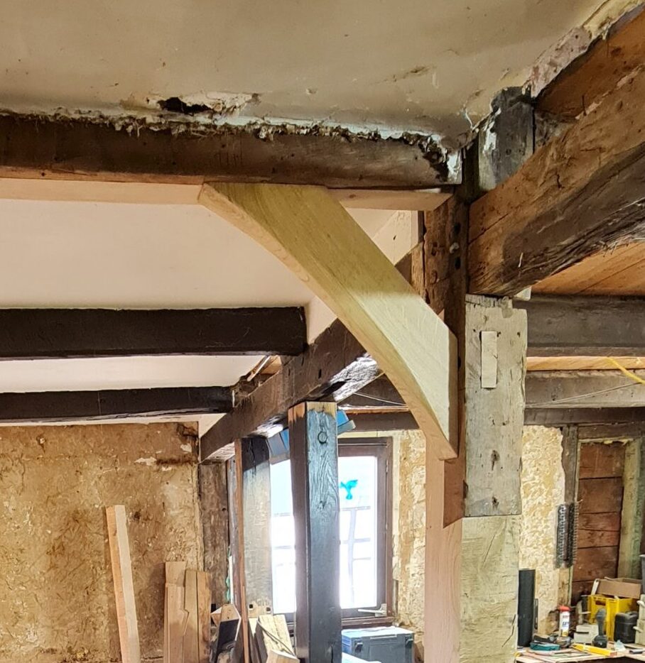 Sorgfalt beim Austausch von statisch relevanten Teilen. Durch das Abstützen wird der Einsturz des Hauses beim Bauen vermieden und Elemente gerichtet.